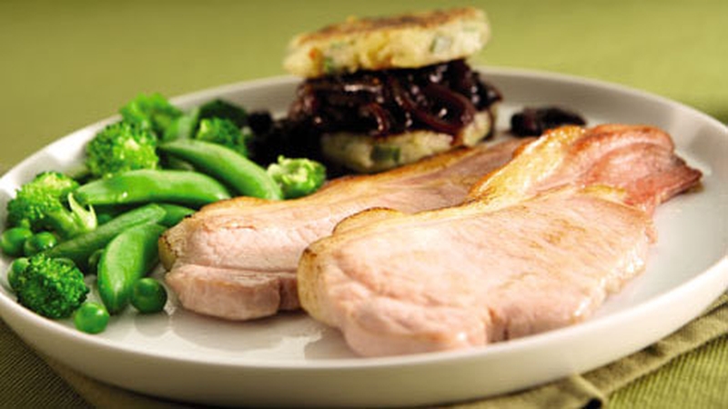 - Slice the cooked bacon joint as required. Serve two potato cakes per person served with lashings of red onion and blackcurrant jam and some steamed greens on the side. Delicious!