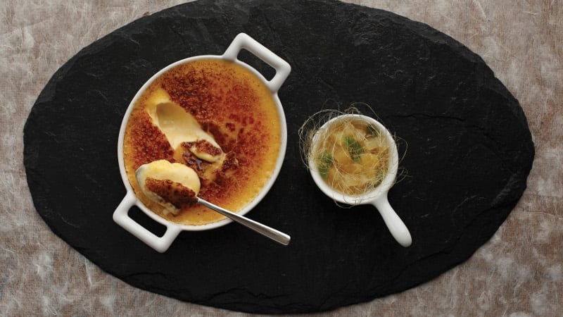 A French classic, and a really creamy and delicious way to end a meal. In the restaurant we like to vary the flavours by using coconut milk, passion fruit or Coole Swan Liqueur. I have my dear friend Léa Linster to thank for this recipe. I normally use a blowtorch, but alternatively place the brulées under a hot grill, watch them like a hawk because they burn very easily. When glazed, they should be a nice mahogany brown colour.