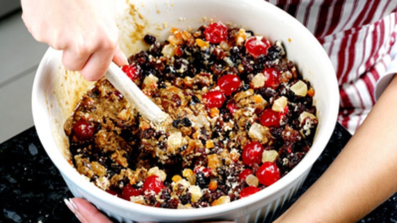 - To make the cake. Line a 7" Cake Tin. Cream butter and sugar together until fluffy. Beat in the eggs. Sieve the flour and spice together and fold into the mixture. Add the dried fruit, cherries, mixed peel and chopped almonds.