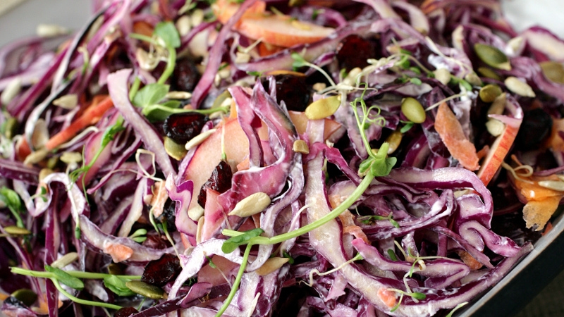 When I first moved to Ireland I was baffled and slightly horrified by the coleslaw/ham and coleslaw/cheese combo. In South Africa I'd only ever had coleslaw as a salad with a 'braai' (BBQ). Now I secretly enjoy this mayonnaisey concoction on a crusty roll! A real superfood, cabbage is such an integral part of Irish cuisine that I decided to give coleslaw the ish makeover. Use red cabbage, add another Irish superfood-seaweed- and lots super seeds and sprouted seeds and you have a super slaw. The dressing in this recipe is a lighter, zingier alternative to plain mayonnaise.