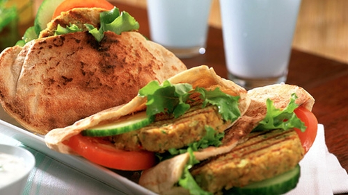 - To serve, place the cooked chickpea burgers on your serving dish with some green salad leaves and spoon over the raita.