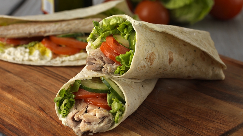 - Drain the fish and divide between the wraps, followed by the tomato, cucumber and lettuce.