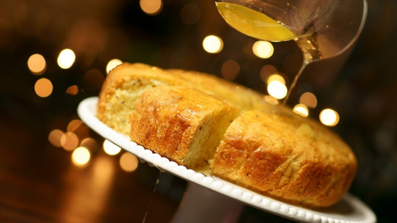 - Take the cake out of the oven. Using a cocktail stick make a number of holes on top of the cake then pour the syrup over the cake and allow it soak into the top of the cake.