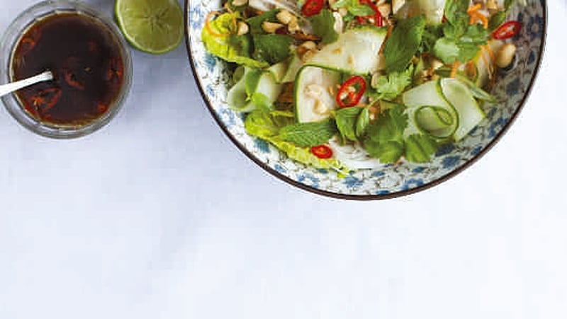 - Then add the noodles, vegetables, peanuts and fresh herbs. Toss to combine and then serve.