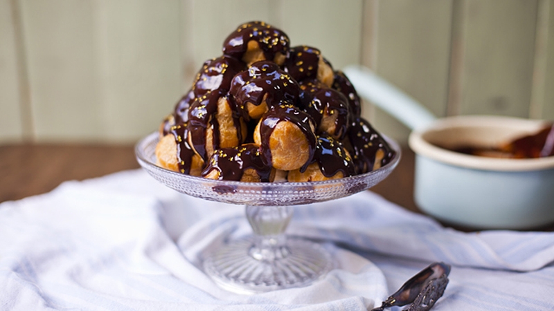 I remember staying in an old Irish guesthouse when I was growing up, where a dessert trolley was rolled around the dining room after dinner and you could pick a dessert of your choice. I could never resist creamy profiteroles smothered in a warm, thick chocolate sauce.