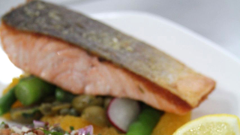 Conor Pope serves up organic salmon on a bed of parsley and crab infused crushed potatoes served with a chilli, mango, papaya and lime salsa & accompanied by purple sprouting broccoli in garlic butter on Celebrity MasterChef Irealnd.
