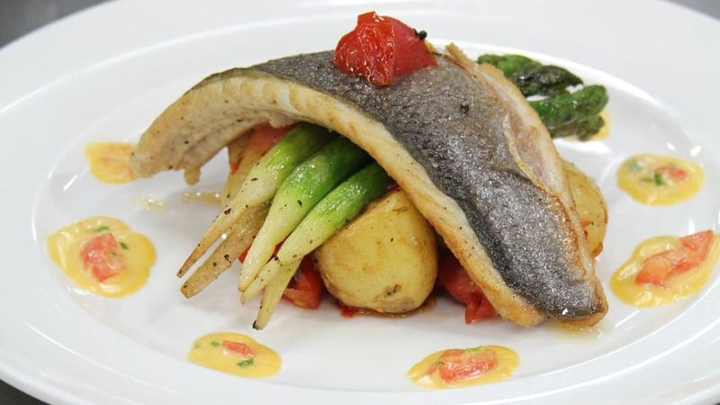Kamal Ibrahim serves up pan seared sea bass with sautéed, lightly spiced baby potatoes served with grilled asparagus and tomato & chive hollandaise sauce on Celebrity MasterChef Ireland