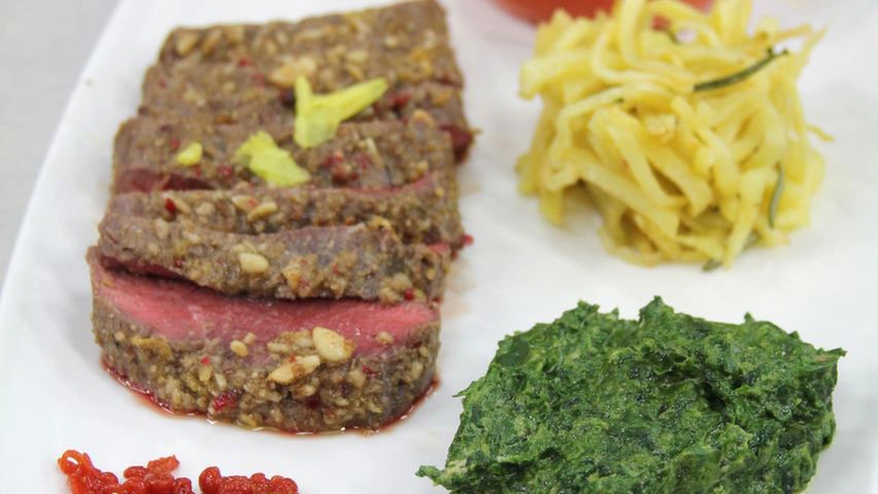 Yvonne Keating for her You on a Plate challenge on Celebrity MasterChef offers Fillet of lamb with pinenuts, Bloody Mary caviar, roasted tomato & creamed spinach served with rosemary straw fries.