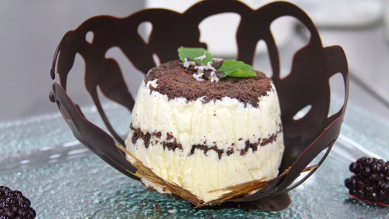 - To serve: Place one mini vienetta in a chocolate basket. Sprinkle with the caramel shards. Serve the blackberries on the side with the syrup.