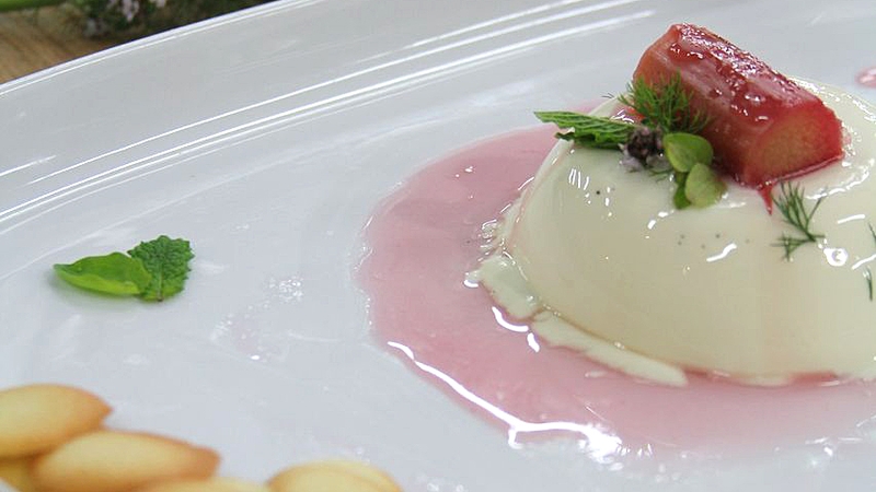 - To serve: Turn out panna cotta, serve with the rhubarb and tuile biscuit.