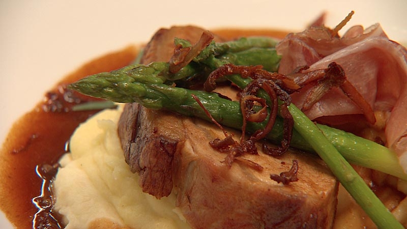 Aengus Mac Grianna serves up pan fried pork chop, celeriac mash, apple & tarragon gravy with fried asparagus wrapped in prosciutto.