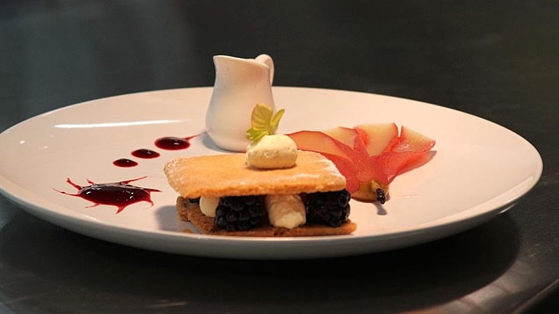 Journalist Conor Pope serves up a delicious dessert of Prosecco and Crème de Casis poached pears with lavender & blackberries, Crème Anglaise and a shortbread on Celebrity MasterChef Ireland.