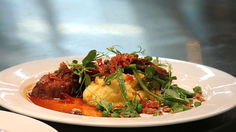 Athlete David Gillick serves up roasted loin of veal, prosciutto, gorgonzola mash, sage and garlic jus accompanied with green beans, lemon zest, walnuts, and peas on Celebrity MasterChef Ireland.