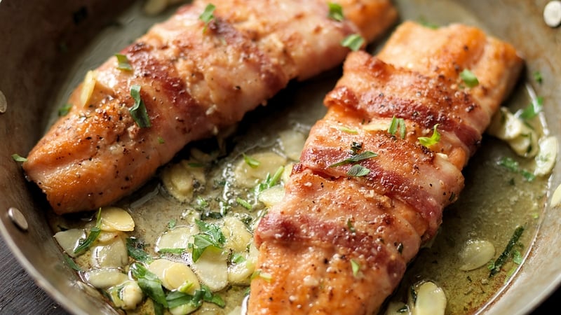 - Lightly flour the trout and wrap each in 3 slices of streaky bacon, then season with salt and black pepper.