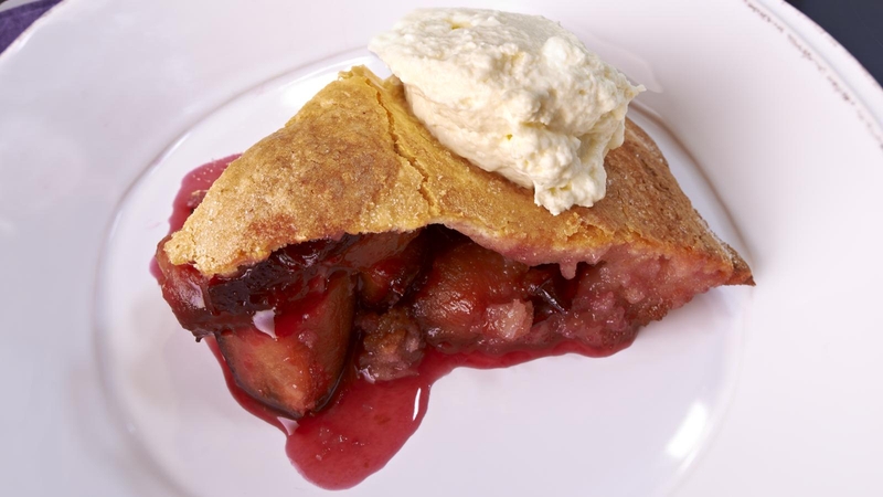- Divide the dough in half and dust one half with flour. (Keep the other half under a clean tea towel so that it doesn’t dry out.) On a well-floured work surface, gently roll out this section of dough into a disc the size of the pie plate. Carefully transfer the pastry to the plate and pile the plums on top, leaving about 2cm (3/4in) around the edge free. Scatter 100g (31/2oz) of the remaining sugar over the plums.