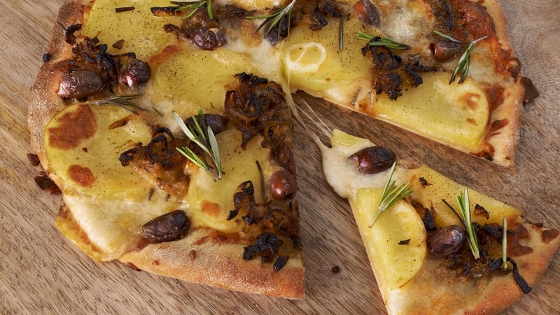 - Sprinkle some of the mozzarella over each pizza base, then top with the potato slices and season with salt and pepper. Cover in the remaining mozzarella, dividing it up between each pizza, then top with the cooked onions followed by the olives.