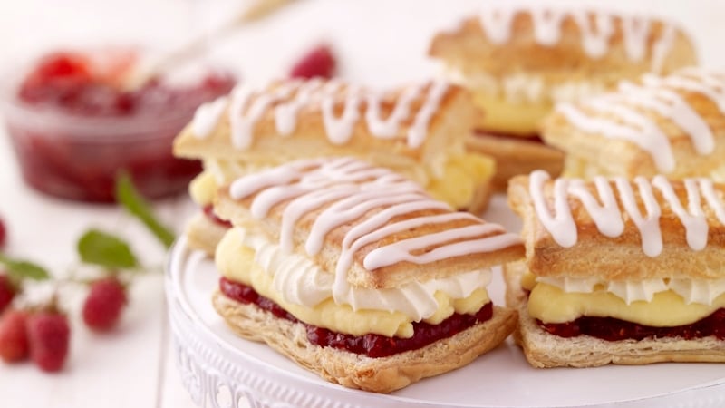 - Whip the cream until thick. Cut the puff pastry in half horizontally. Spread one tablespoon of raspberry jam on the bottom of the pastry. Then add a layer of custard, cream and top with the remaining puff pastry.