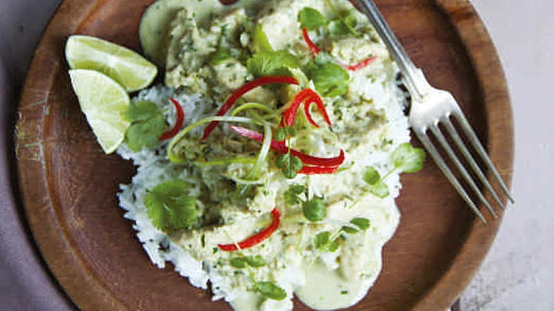There is something altogether soothing about this recipe. The usual heat you'd expect from an Asian-inspired recipe bows out to make way for the more aromatic and fragrant coriander, lime zest and lemongrass, which is wrapped together by a creamy coconut broth. You could replace the chicken with prawns or sturdy vegetables like sweet potato.