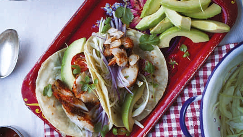 Fish tacos are a Californian classic, taking inspiration from wonderful Mexican heat and spice. They make a truly different feast to serve for friends. If you don't want to fire up the barbecue, the fish can easily be cooked on a griddle pan.