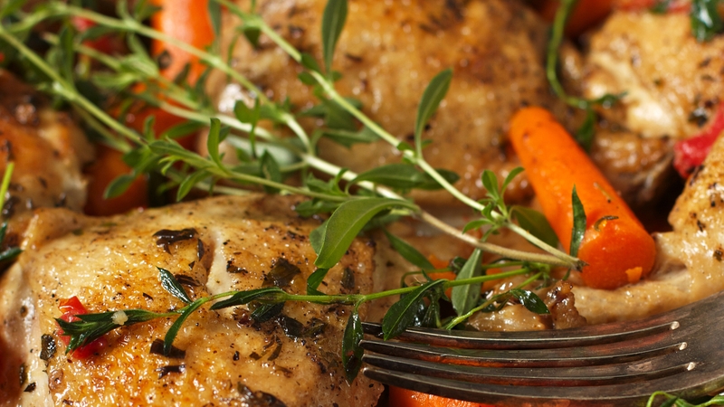 - Pour over the chicken in casserole and transfer to hot oven at 160 degrees for 1 hour. Add Crème Fraîche and freshly chopped parsley before serving.