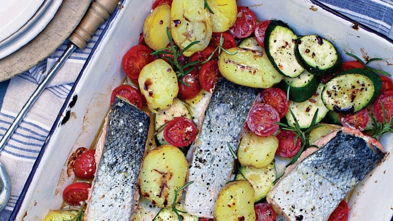 - Drizzle a little of the olive oil with a sprinkle of salt onto a roasting tray. Place the salmon, skin side up into the roasting tray and scatter the potatoes, courgettes and tomatoes around the salmon, followed by the rosemary, then season.