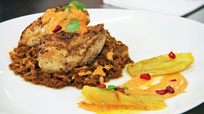 - Cut the chicken breast into two at a 50 degree angle from horizontal. Plate the first piece of chicken on the lentils and then the second resting on the first.