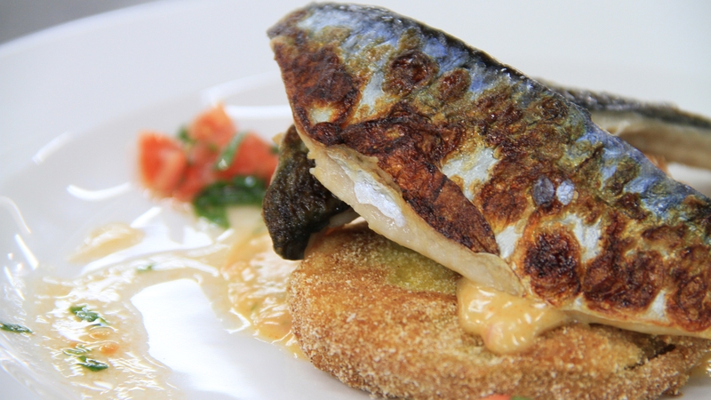 - Place 1 mackerel fillet skin-side up on top of tomato