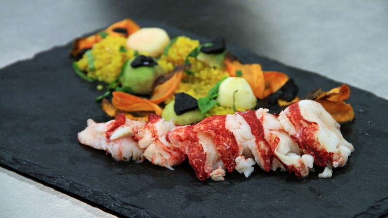 - Arrange slices of lobster tail on opposite side of the plate & season