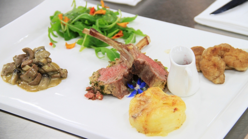 Lamb presented in 3 ways; 1. - A herb crusted rack of lamb, with 2. - Lamb kidneys in mushroom and cream and 3. - Lamb sweetbreads, all served with a potato gratin, red wine jus and watercress and rocket salad.