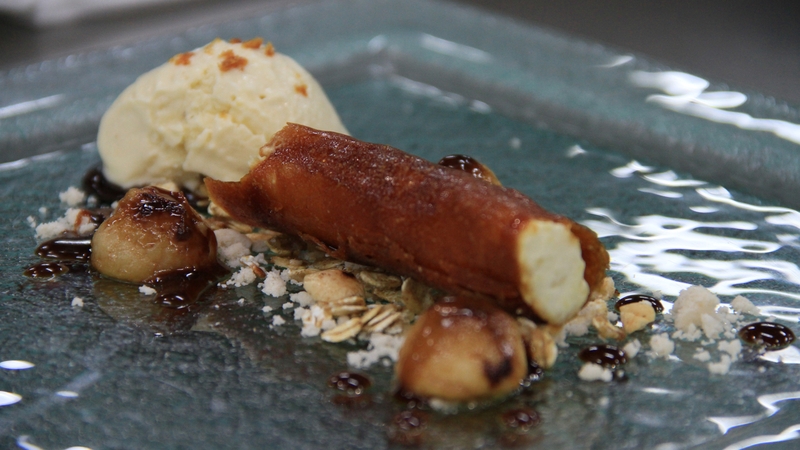 - - The butter powder will form the base of the dish, then a sprinkling of the oat and hazelnut. The mousse filled tube(1) will be the centerpiece and the ice cream and sorbet will be placed on either side of the tube. The caramelised apple balls(3) will be placed randomly in the arrangement. Dots of the syrup will arranged on the dish. The blackberry pearls will be scattered in top of the plating arrangement and on top of that some small sprigs of the basil.