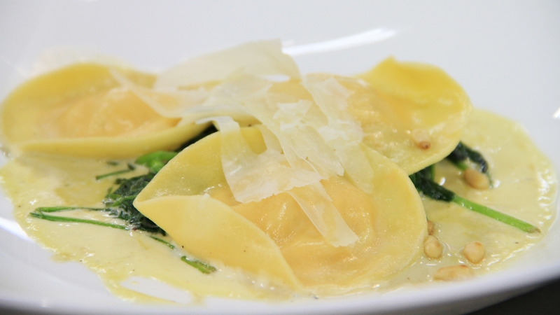 - Bring cream, garlic + thyme to the boil + add grated pecarino + season