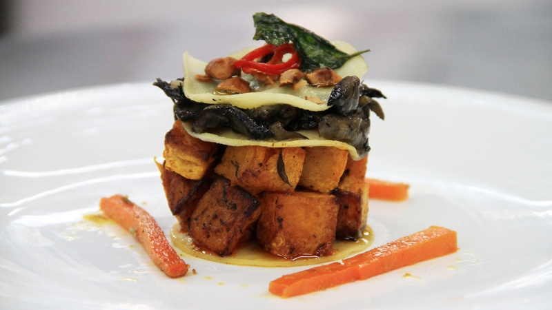 - Using ring to keep the stack stable, layer butternut squash, pasta, mushrooms