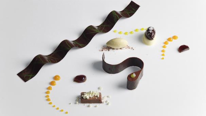 - Melt the chocolate in a mixing bowl over a pot of warm water and set aside. Whisk the cream until it has the consistency of yoghurt. Whisk the egg whites until stiff and add the sugar, whisking until a nice shine appears. Fold this mixture into the melted chocolate, and when it’s well combined, add the cream. You should have a smooth mousse. Divide the mousse into small bar-shaped moulds and even out the top with a palette knife. Set in the freezer. To use, unmould the mousse when needed and place it on the plate to bring it up to temperature