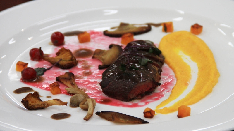 - Heat up a little vegetable oil in a small frying until very hot and quickly fry the prepared mushrooms until beginning to colour. Meanwhile using a pastry brush, paint some brushstrokes of redcurrant syrup ion your serving plate. Re-heat the carrot purée and swipe some to the side of the plate. Slice a wood-pigeon breast into 3 or 4 slices and place in the centre of the plate. Place the roasted butternut squash chunks and mushrooms randomly around the pigeon. Serve