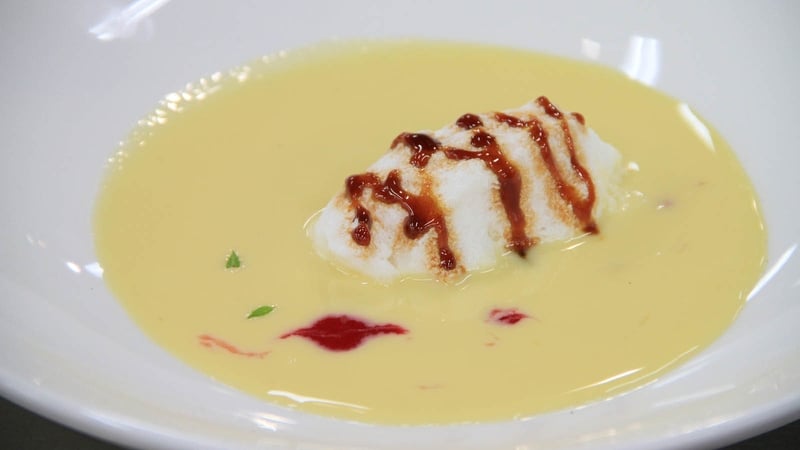 - Remove the crème anglaise from the fridge and spoon some on to a flat plate with a rim. Place two poached meringues gently on top of the crème anglaise.