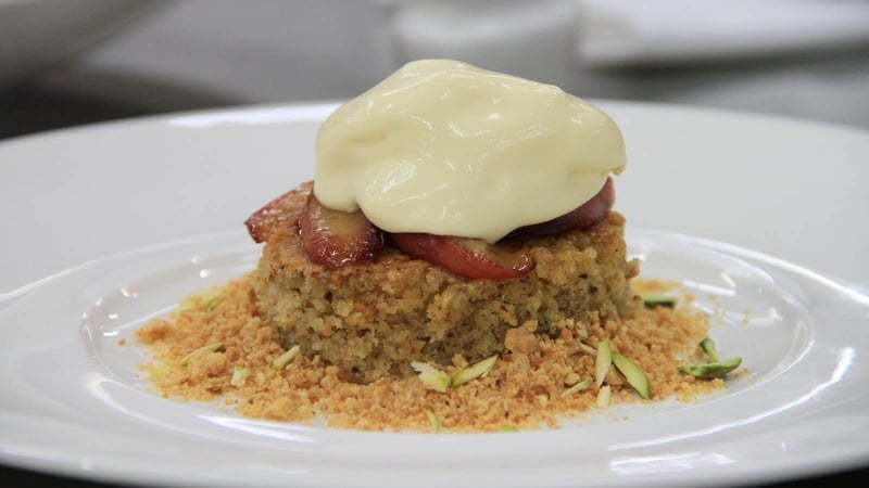 - To assemble cut a piece of the cake and place caramelised peaches on top. Put a quinelle of mouse on top of the peaches and sprinkle with the white chocolate crumb.