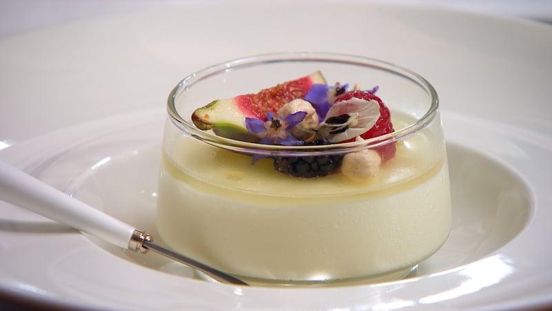 - Place a small selection of fruit on each set pannacotta and some mini edible flowers.