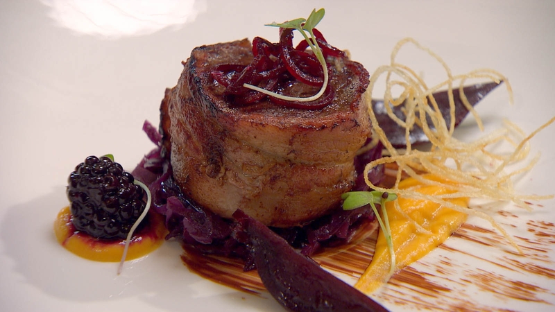 - Plating up: Glaze few blackberries in the beetroot liquor, use pan juices to create sauce,grate some chocolate into sauce at the end.Heat vegetables,and arrange them onto the plate. Fry few flat leaf parsley leaves as garnish.