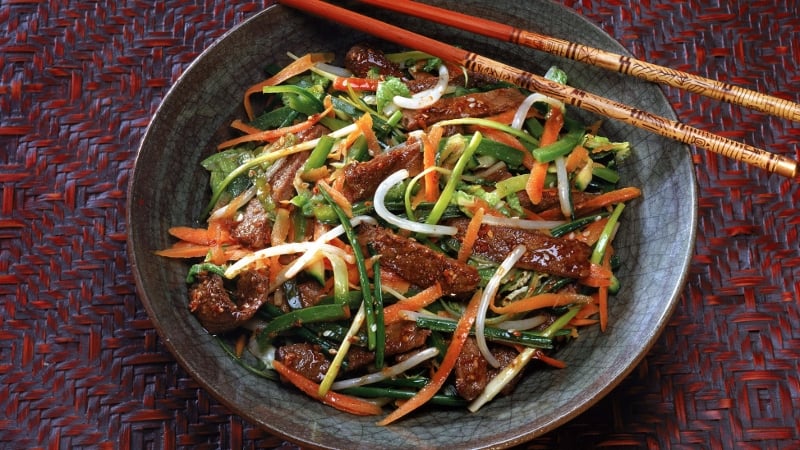 - To serve place the vegetables on a plate and place the slices of beef on top.