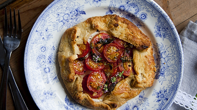- On each circle, dollop on the ricotta and carefully place the tomato mixture on top. Slowly fold the pastry in towards the tomatoes. Brush with a beaten egg and season with salt and pepper.