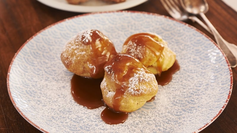 - To finish, place the choux puffs on serving plates, dust with icing sugar, then pour over the warm caramel sauce to serve.