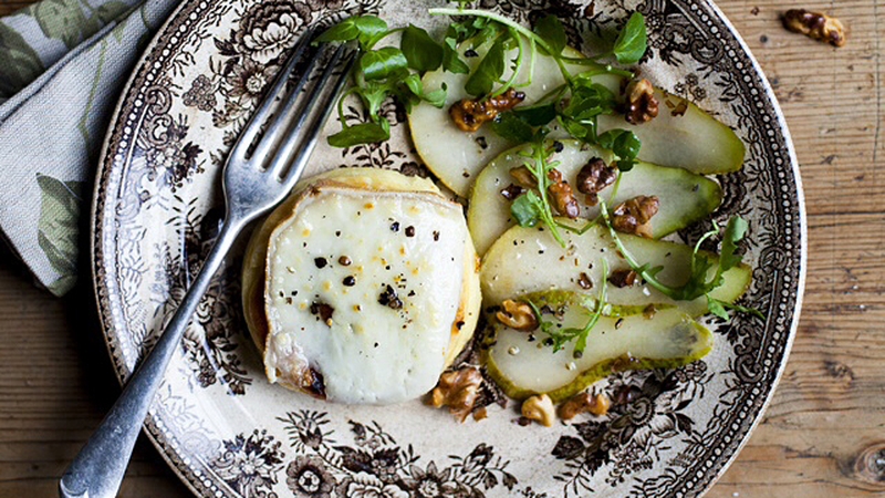 - Meanwhile, make the pear salad. Toast the walnuts in a baking dish for about 10 minutes until lightly golden. Leave to cool a little and roughly chop. Using a mandolin or very sharp knife cut the pear into wafer-thin slices and toss in the lemon juice to prevent discoloration. Add some salt and pepper and set aside until you are ready to serve.