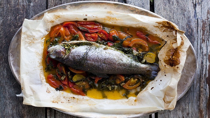 - Divide the fennel mix between the squares of parchment paper, place a trout fillet on top of each pile of vegetables. Drizzle over the rest of the olive oil, then add a squeeze of lemon juice and the dill.