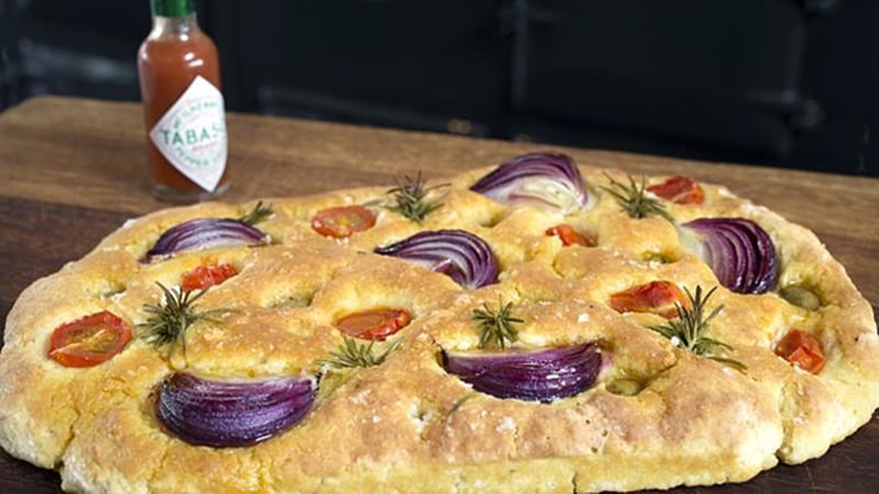 - When the focaccia is cooked but still hot, mix together the olive oil and the Tabasco and drizzle over the top. Allow to cool slightly before serving.