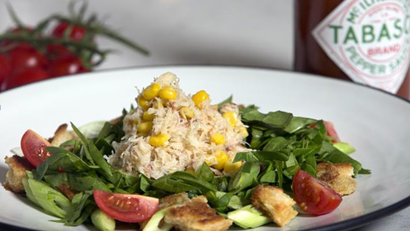 - Mix together the mayonnaise and the Tabasco sauce. Stir in the shredded leaves, crab meat and sweet corn , then season to taste, adding more Tabasco if you wish.