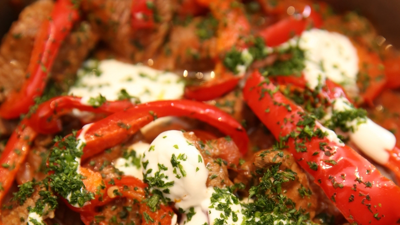 - Add the onions to the frying pan and cook for two minutes. Add the butter, garlic and paprika. Cook for a further minute. Take off the heat and add the flour, tomato purée, and tinned tomatoes. Bring back to the heat and stir until boiling. If sauce is too thick, add a little water. Add the bouquet-garni and salt and pepper. Pour the sauce into the casserole dish and put in a pre-heated oven at 160C for one and a half to two hours. Garnish with sour cream and chopped parsley.