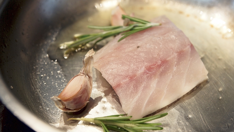 - For the sea bass, heat up a non-stick frying pan until really, really hot. When hot add a little cooking oil, season the fish and place skin side down into the pan.