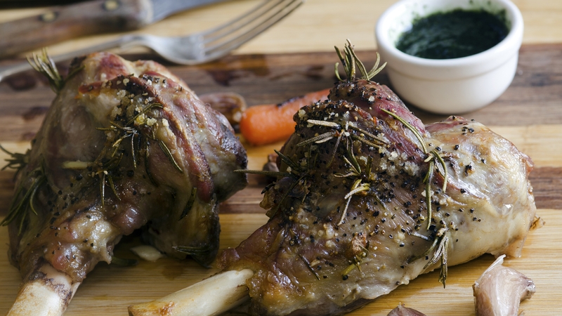 - Season the lamb with salt and freshly ground black pepper and place in the oven.