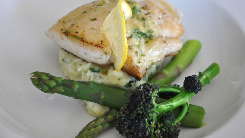 - Divide the garlic mash between 4 warm plates, pop a piece of hake on top and serve with asparagus and purple sprouting broccoli. Season with a little lemon juice.