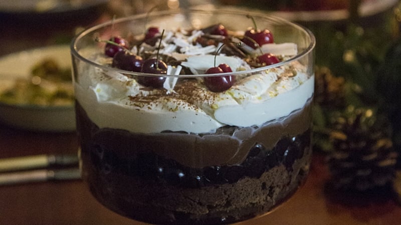 - Cut the brownies into small squares and use to cover the base of a trifle bowl. Spoon over the cherries along with their syrup. Spoon over the chocolate custard, then cover with cling film and chill while you finish making the topping.